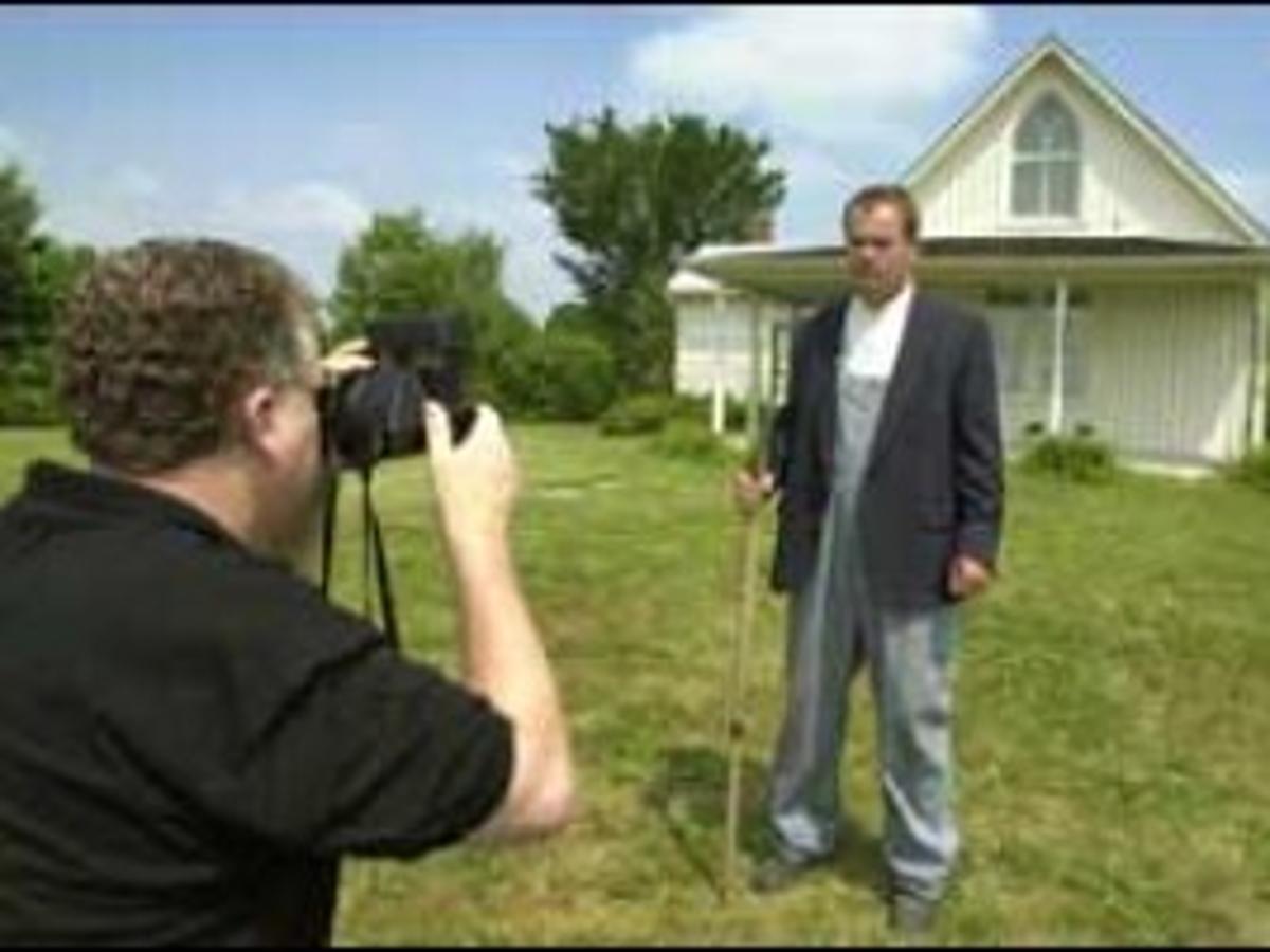 He sent to Chicago for the mans overalls and womans apron decided a pitchfork would look better than a rake added his mothers cameo to the womans outfit and finished his painting. Yale University Art Gallery. ADVANCE FOR SUNDAY AUG 5Bruce Thiher takes a picture of tourist Dave Heckman of Des Moines Iowa in front of the American Gothic.
